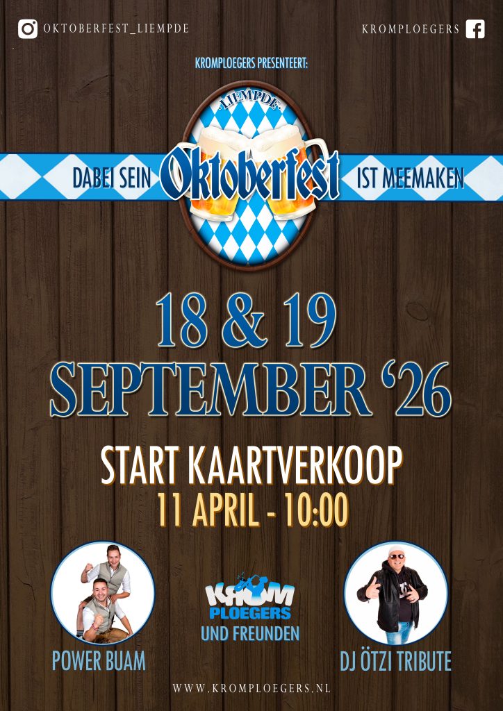 Het Traditionaler Oktoberfest van De Kromploegers kommt auch dieses jahr zurück mit op 18 & 19 september 2026. 2 tagen oktoberfest mit op vrijdag DJ Ötzi Tribute en op zaterdag Power Buam. Beide tagen natürlich mit De Kromploegers! Das wird SUPER TOLL!